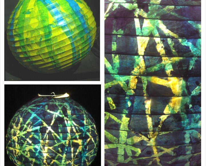 Process Explanation: First I painted a base layer of gradient blue, with splattered white paint. Then I placed strips of painters tape and painted another layer of blue paint, creating a striped pattern. Taking off all the tape, I then spray painted the entire globe white and placed tissue paper on the entire surface. There fore in the day the globe has one design, with yellow and blue vertical stripes (tissue paper)-and when a light is placed inside, it glows a completely different lined pattern! In the dark with out a light it also glows in the dark. I splattered clear glow in the dark paint on the globe, but unfortunately the glow in the dark paint wouldn’t photograph. That’s the run down on all the crazy steps to make this lantern. I think it turned out super cool, tell me what you think!