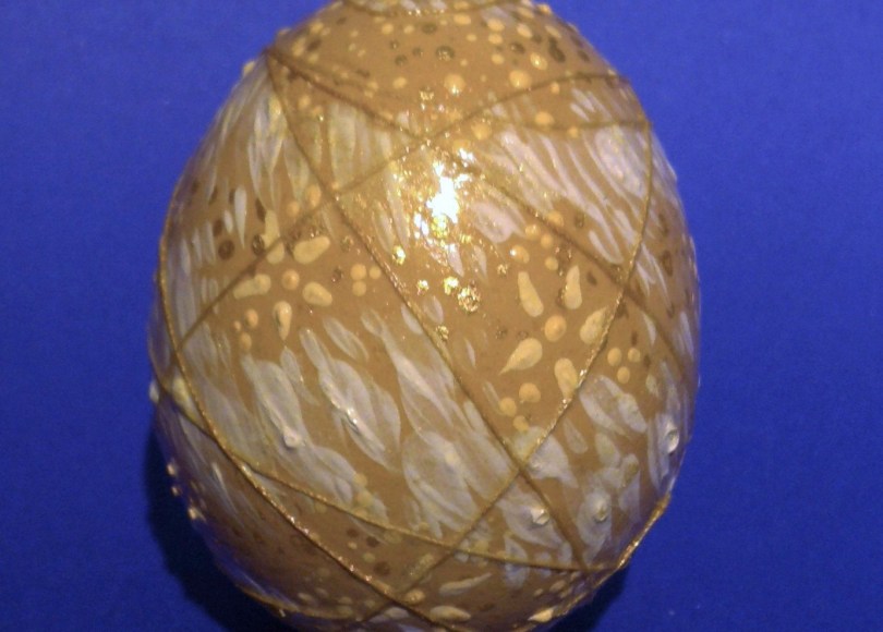 I hope to experiment with the use of egg shells in the future! I used acrylic paint, string, gold fabric paint, and clear gloss varnish.
